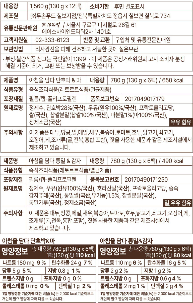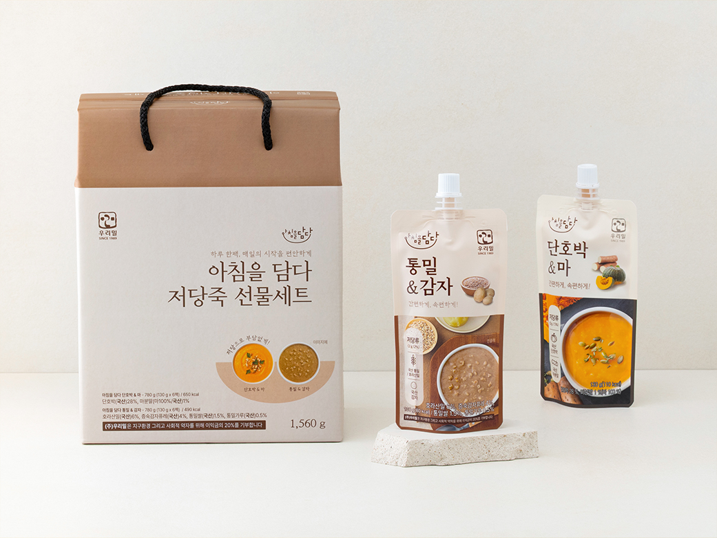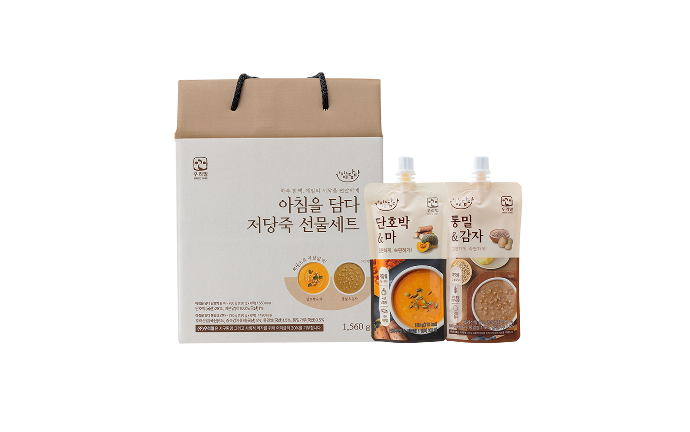 안심할 수 있는 원재료와 부담 없는 칼로리, 편리한 섭취와 보관까지 갖춘 저당죽 2종 세트입니다. 단호박과 마를 비롯해 쌀과 찹쌀까지 모두 국내산으로 엄선해 만든 단호박&마 죽과 풍부한 영양과 고소한 맛의 호라산밀과 감자 모두 국내산으로 엄선해 만든 통밀&감자 죽 2가지를 한 박스에 담았습니다. 데우지 않아도 부드럽고 담백하게 즐길 수 있어, 바쁜 아침 한 끼로 안성맞춤이에요. 손잡이 끈이 달린 박스형 패키지로 별도 포장 없이 정성 있는 선물로 전하기에 제격입니다.